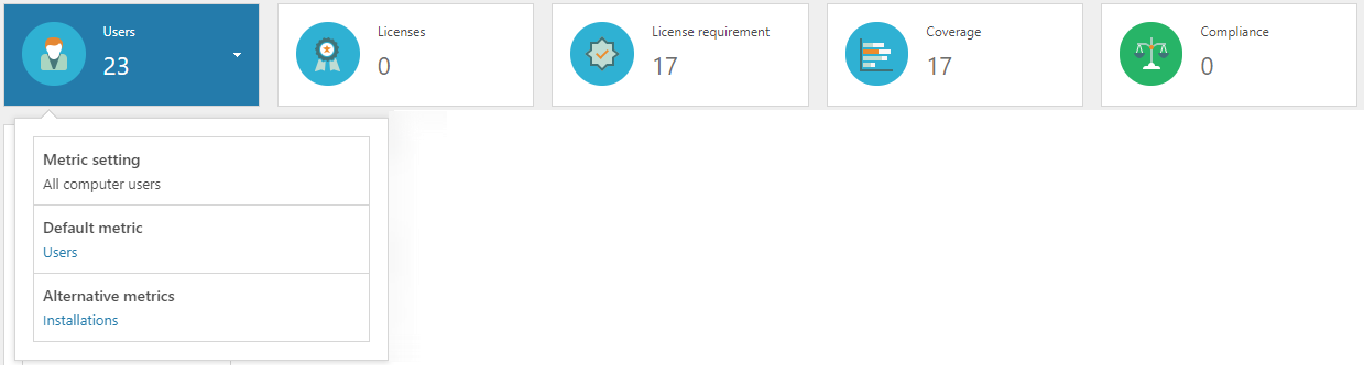 Im Kopfbereich werden die Berechnungen angezeigt, die auf der Basis der für die Anwendung eingestellten Metrik vorgenommen werden. Falls Lizenzen nicht unter Verwendung der für die Anwendung festgelegten Metrik, sondern mit anderen Metriken registriert wurden, werden weitere Bereiche mit den entsprechenden Berechnungen angezeigt.