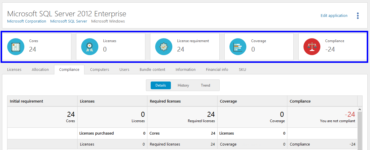 Nachdem die Compliance berechnet wurde, zeigt sich, dass für die Anwendung Microsoft SQL Server 2012 Enterprise dank der VM-Nutzungsrechte die Abdeckung gegeben ist. Der Lizenzbedarf wird an die Anzahl der Kerne der physischen Hosts angepasst, denen die Lizenzen zugewiesen wurden.