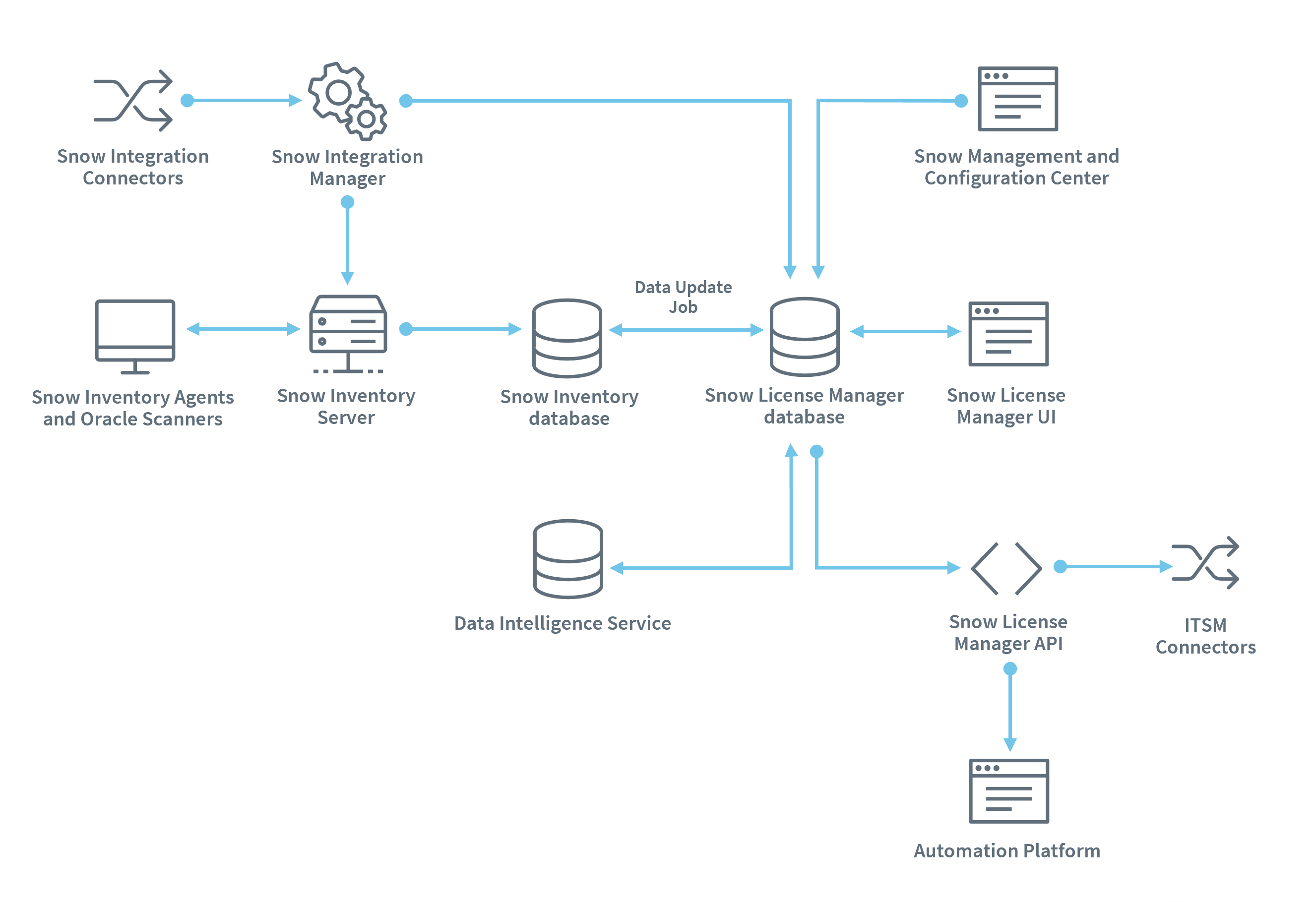 | ITSM Connectors | The ITSM connectors update third-party configuration management databases (CMDB) with normalized data, to enhance data quality, by pulling data from the Snow License Manager API and sending it to the CMDB. For more information, see ITSM Connectors. |